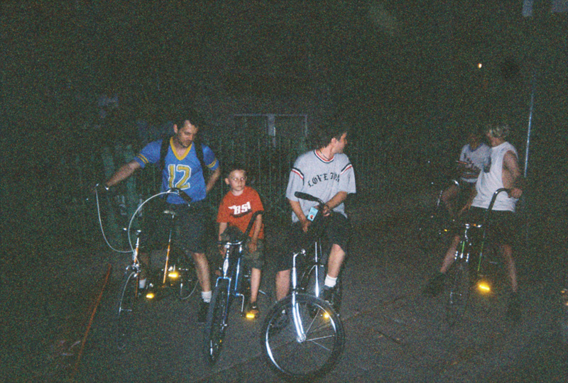 One summer night, a bunch of Rats ran into the Stingray Kids, another bike club in town. They all live in a big house and ride vintage schwinns. Since then we've forged an alliance between the two clubs and, of course, are always trying to get them to chop those bikes up. Their "leader" is Papa Wheelie (right), and that's his son, Training Wheelie, in the middle.
